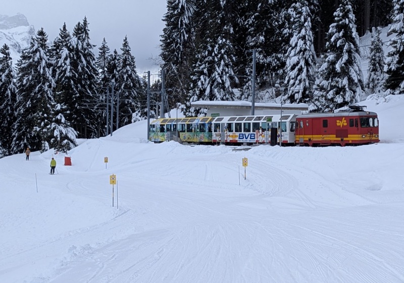 From anywhere in Switzerland, getting to the ski resort is simply a matter of trundling along the main railway line between Montreux & Martigny to stations at either Aigle (for Les Diablerets by train, or Villars by bus) or Bex (for Villars, Bretaye or Gryon by train) and then catching the relevant connection to your favoured destination. So very Swiss. The train station at Col de Bretaye is wonderfully located in the centre of the ski area right amongst the lifts & pistes. A nice learn-to-ski area is a few steps away, as is the Grand Chamossaire chair to take freeriders up to extreme steeps. Perfect.