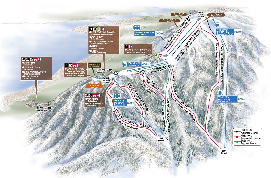 Biwako Valley Ski Resort is quite small with only 8 courses and 5 chair lifts (2 quads & 3 doubles). The Biwako Valley Ropeway heads up from the carpark to an elevation of 1,108 metres to the ski area proper. From there, slopes head in a couple of directions, and the maximum vertical of the runs is only 224 metres (950 to 1,174 metres). Check out the ski trail map for Biwako below.
