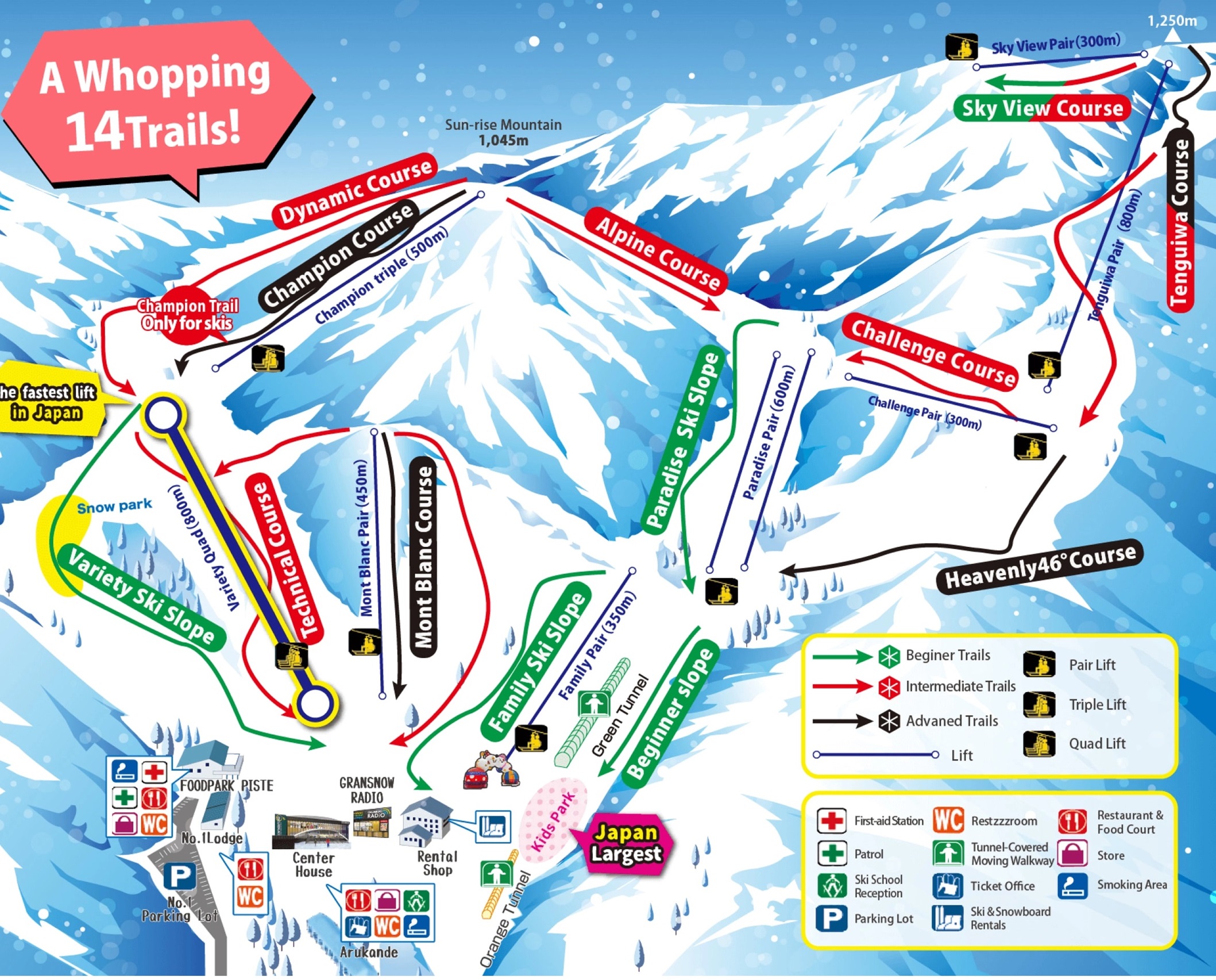 Okuibuki Ski Resort is a small to medium sized Japanese ski resort with 14 trails, and only 13 of these are open to snowboarding. That’s of course if all the runs are open. There are two distinct sides to the ski area, with lookers’ left heading up to Sunrise Mountain at 1,045m elevation, and lookers’ right up to 1,250 metres. The base is at 700m, so the vertical is 550 metres. See the chuckle worthy Gransnow Okuibuki ski trail map below.