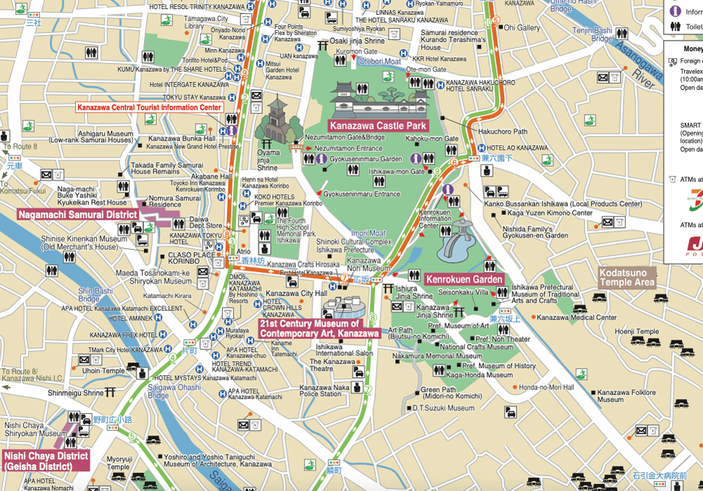 The city of Kanazawa isn’t too large so you can see many attractions on foot from your hotel or explore by bicycle. Or very conveniently, there are a couple of bus loops that head about a main block wide of the Kanazawa Castle park and the Kenroku-en gardens, and run to and from Kanazawa Station, so if you stay reasonably centrally, you’ll be easily able to go sightseeing.