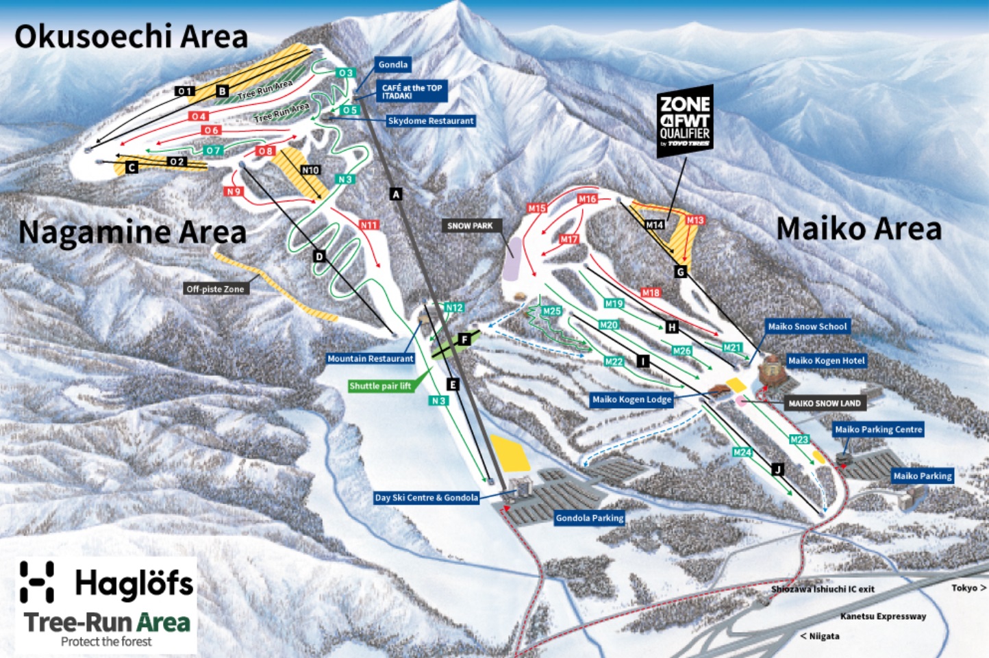 The “Maiko” side features the Maiko Kogen Hotel near the base, and the lower half is exclusively made up of beginner runs. Some that are so mellow that skiers might need to pole on a powder day whilst snowboarders might want to buddy up with a skier. Further up the hill are some easy intermediate runs plus a small steep zone.