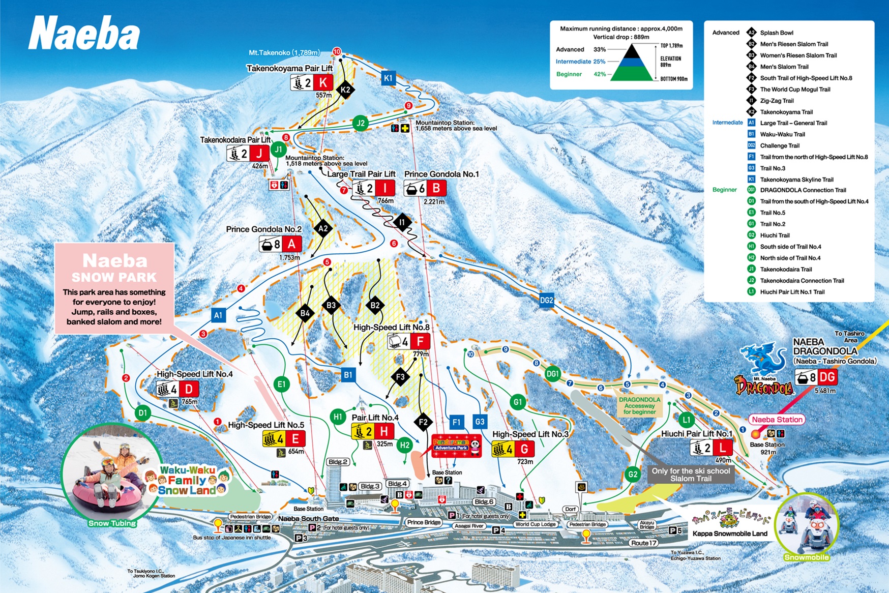 The bottom half of the ski resort is really wide and has largely beginner and intermediate slopes. Further up the mountain it’s much steeper and the piste terrain funnels into a narrow sub-alpine area. Check out the Naeba Ski Trail Map below.