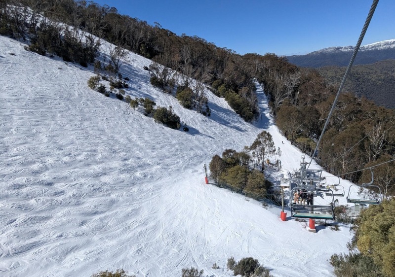 Despite its reputation, there were zero lift lines on this day. Having the full complement of 13 chairlifts running certainly helps, but the time of year was a major factor too. To see all the lifts spinning was a rare treat on a ski hill that often receives only half the snowfall of the other major Victorian ski resorts.
