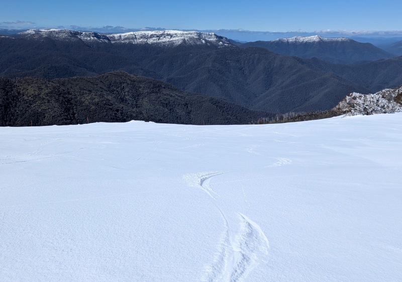 From the top of Tirol I did a full lap of the mountain with a few repeats & variations here and there. Nice soft turns on the top half of Grimus were quickly forgotten after the cruddy bumps on the lower half. Off-piste from the true summit and the just out of bounds Chute 1 was fun, with the smear of fresh just making the snow forgiving enough to avoid death. The snow between Summit chair & Fanny's Finish was the pick of the day, with fresh, windblown powder turns available nearly all the way down to Howqua chair. Powder Keg into Wombat quad chair was more keg than powder, but I knew by then what to expect for the day (and it is a favourite from the old days). The lower half of Federation was a horror show for most, but the locals appeared to think it was the greatest thing since sliced bread. Good for them. Snow cover in Bull Run bowl were better, but cruddy bumps still ruled the day, and I probably didn't have the most appropriate skis on for the conditions. But we are Powderhounds, not Cruddybumphounds, so fatter skis it is!